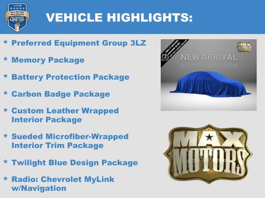 3LZ Interior Trim, 8-Way Driver & Passenger Seat Adjusters, Apple CarPlay, Auto-Dimming Inside Frameless Rearview Mirror, Battery Protection Package, Body-Color Outside Heated Power-Adjustable Mirrors, Bose Advanced 10-Speaker Audio System Feature, Carbon Badge Package, Cargo Net, Custom Leather Wrapped Interior Package, Exterior Parking Camera Rear, Front Curb View Cameras, GT Bucket Seats, Head-Up Display, Heated & Vented Driver & Passenger Seats, Heated door mirrors, High-Intensity Discharge Headlights, Illuminated entry, Luggage Shade, Memory Package, Painted Body-Color Carbon Fiber Removable Roof Panel, Performance Data & Video Recorder, Power Lumbar/Bolster Seat Adjusters, Preferred Equipment Group 3LZ, Radio: Chevrolet MyLink w/Navigation, Remote keyless entry, Remote Vehicle Starter System, Shark Gray Painted Exterior Vents, Steering wheel mounted audio controls, Sueded Microfiber-Wrapped Interior Trim Package, Theft Deterrent System, Twilight Blue Design Package, Universal Home Remote, Variably intermittent wipers, Wheels: 19" x 10" Fr & 20" x 12" Rr Z06 10-Spoke.